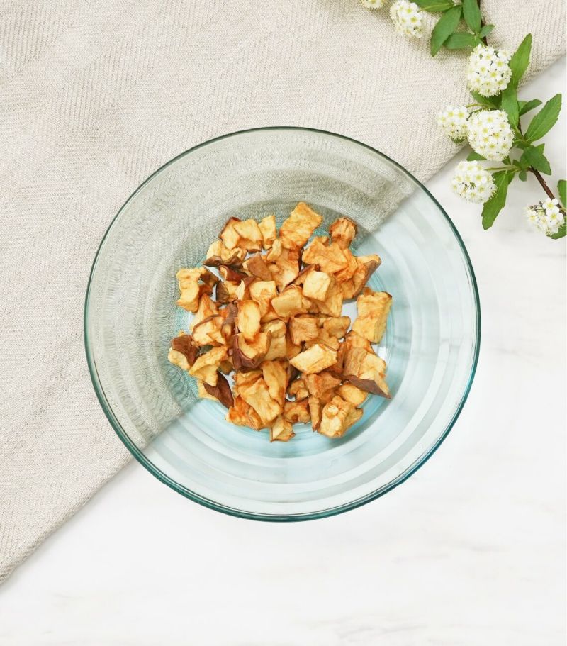 長野県産の甘いりんごをそのまま低温ドライ。 皮ごと乾燥させて、栄養も甘さもギュッと凝縮しました。 りんごはビタミンや整腸作用のある水溶性食物繊維(ペクチン)、利尿作用のあるカリウム、効率よくエネルギー源になる糖類を豊富に含んでいます。 一口サイズなので、トレーニングのご褒美やフードのトッピングにおすすめです。