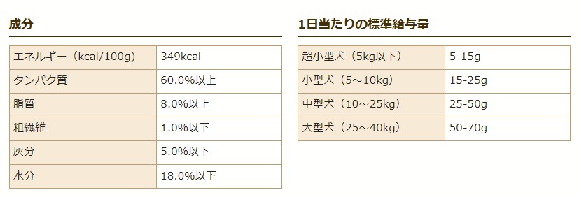 ≪与え方≫・上記の表を目安に愛犬の大きさ、健康状態、年齢、運動量、妊娠期などを考慮し、食べ残しや便の様子をみながら1日2~3回に分けてお与えください。・生後3カ月未満の幼犬には与えないでください。・愛犬の食べ方や習性によっては喉に詰まらせることがありますので注意してください。・与えすぎには注意してください。≪保存方法≫・開封前 直射日光、高温多湿を避けて保存してください。・開封後 冷蔵庫で保管し、賞味期限にかかわらず早く与えてください。※品質保持のため脱酸素剤を封入しておりますが、これは食べられません。※手に持って与える場合は、かまれないようにご注意ください。※子供が誤食しないように、子供の手の届かない所に保管してください。※子供がペットに与える時は、安全のため大人が監視してください。
