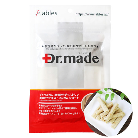 Ablesシリーズでは1袋に2000mgを配合、Dr.madeシリーズでは獣医学術雑誌CAPに掲載された報告「ペットスリムの肥満治療効果ネオペッツ動物病院グループ/細井戸大成」に基づき、減量効果が見込めるとされる量である8000mgの難消化性デキストリンを配合した愛犬用スナックを提供しています。
