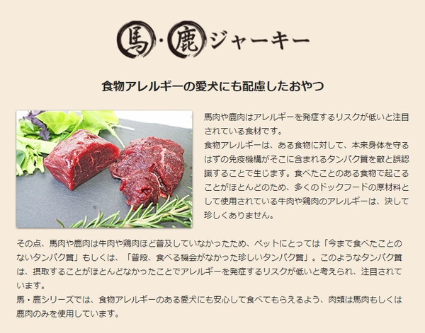 食物アレルギーのあるわんちゃんにも配慮して、肉類は鹿肉のみを使用しています。