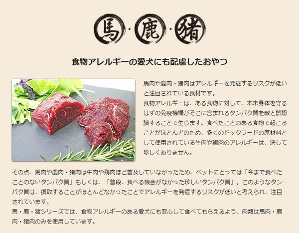 食物アレルギーのあるわんちゃんにも配慮して、肉類は猪肉のみを使用しています。