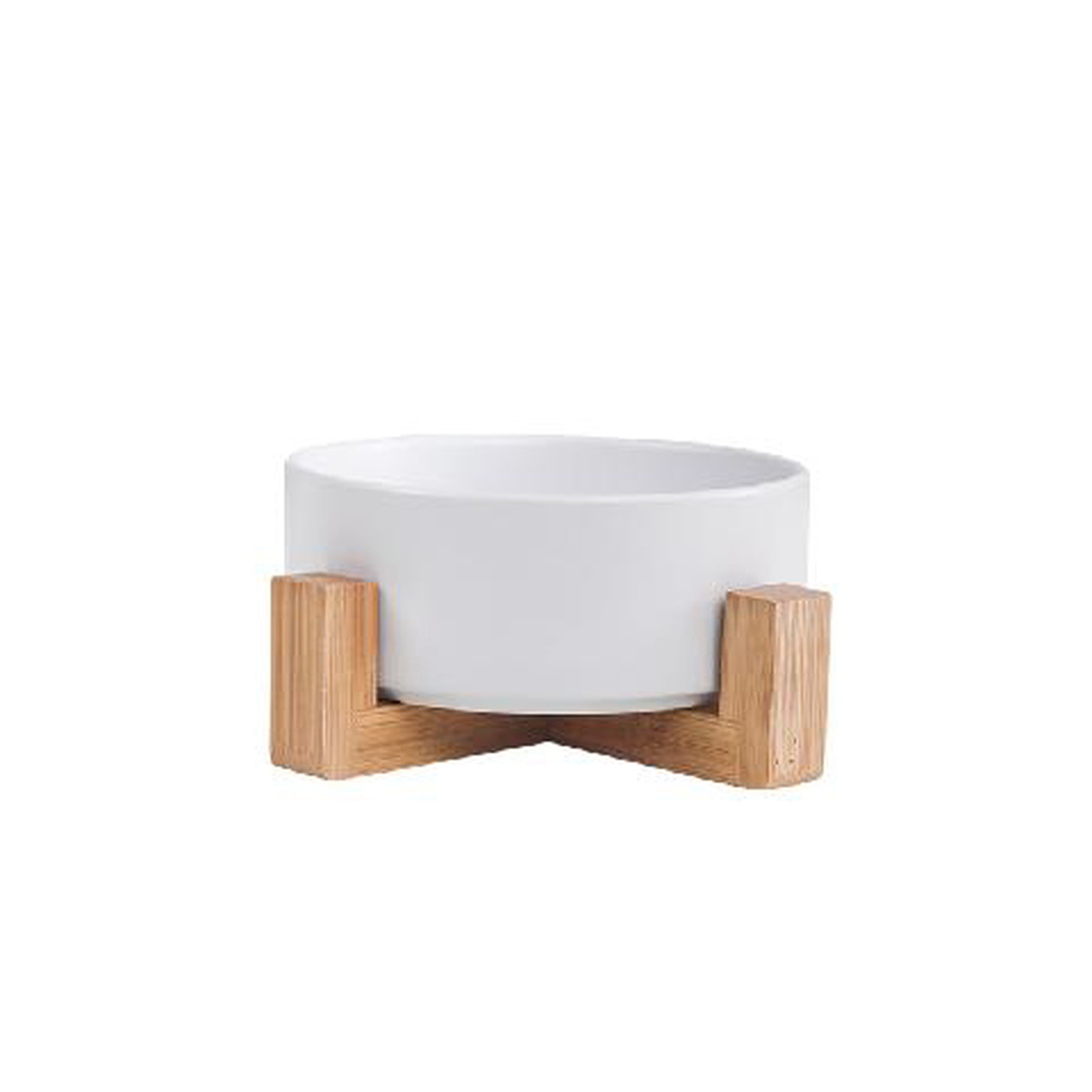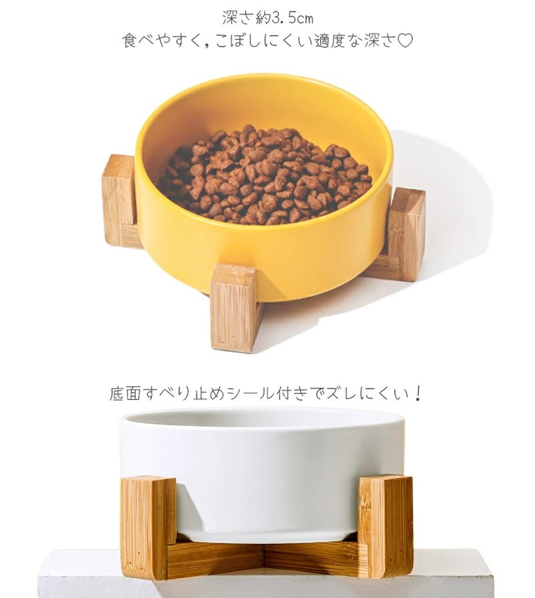 小型犬や猫にちょうどいいサイズ。小物入れにも使えるかわいいデザインの陶器製ボウル。 高さがあるので食べやすく、ペットの体への負担を和らげ、楽な姿勢で食事ができます。 スタンドは丈夫なバンブー素材でできていて、きれいに表面が研磨されているので安心してお使いいただけます。 食器は陶器製で、電子レンジ・食洗器の使用が可能なのでとっても便利! 食器台は強度が高く腐りにくいです。抗菌性にも優れています。