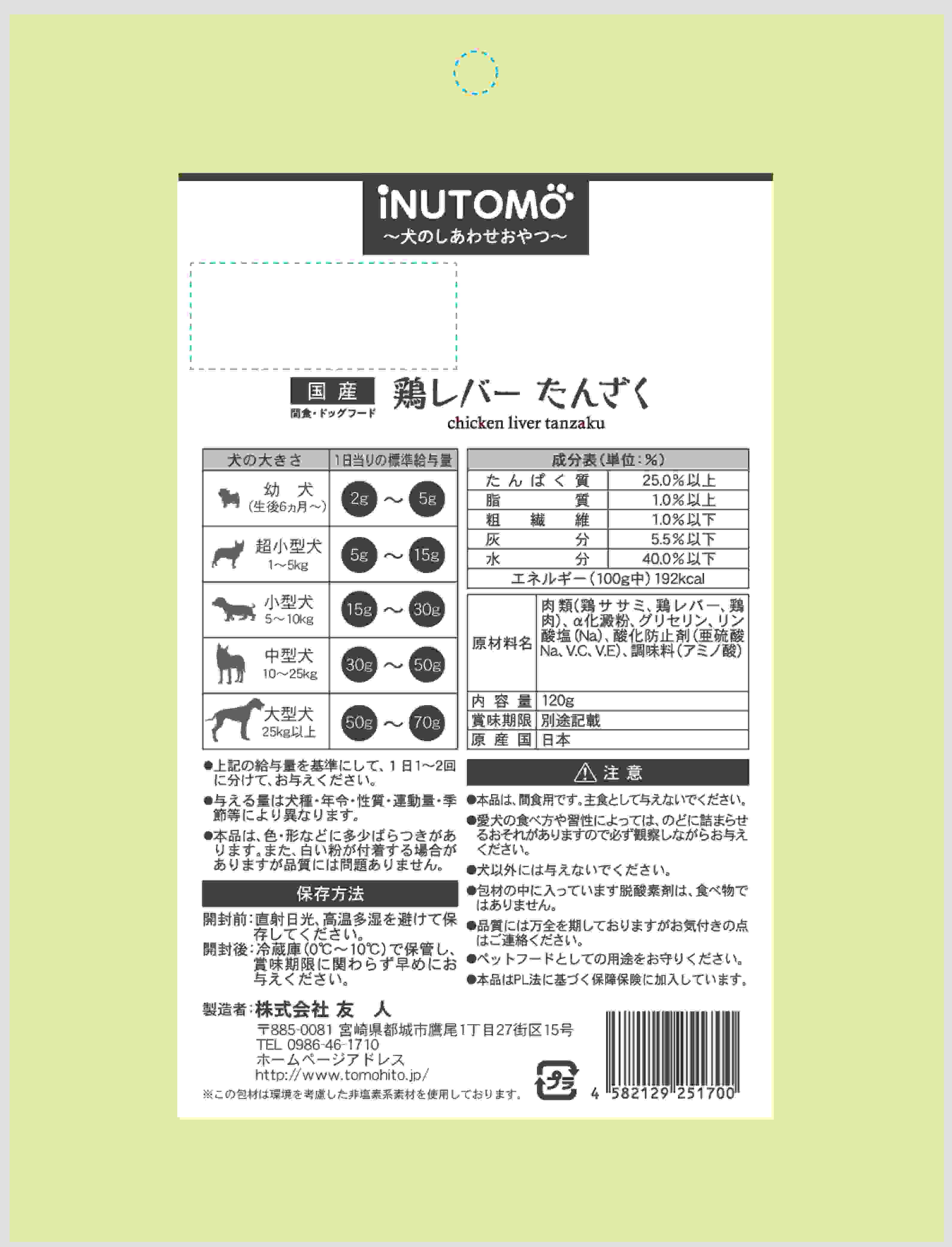 肉類(鶏ササミ、鶏レバー、鶏肉)、α化澱粉、グリセリン、リン酸塩(Na)、酸化防止剤(亜硫酸Na、V.C、V.E)、調味料(アミノ酸)