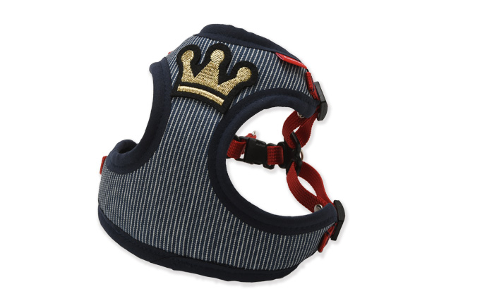 ヒッコリーストライプの小型犬用ハーネス。大きなクラウンワッペンが付いています。ベルトに使用しているテープが柔らかく、裏地のスポンジもとっても柔らかです。前足を通し、背中でカチッと留めるだけで装着完了。簡単に着脱できるハーネスです。サイズ調整も可能です。