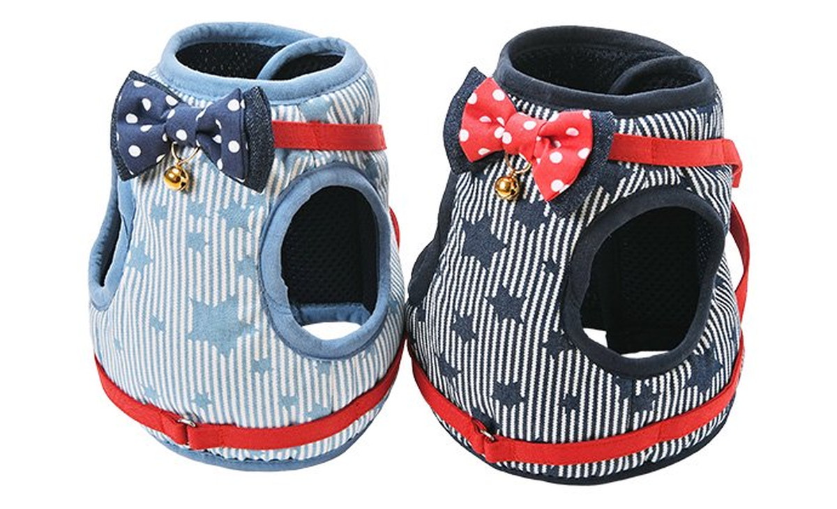 爽やかなブルーのストライプにドット柄のリボンがかわいいねこ用ハーネス