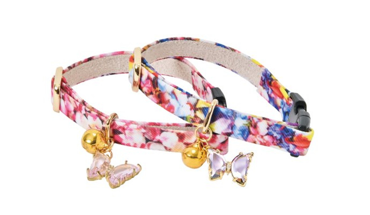 鮮やかな模様のベルトと透明感のあるバタフライチャームでラグジュアリーな雰囲気のねこ用カラー
