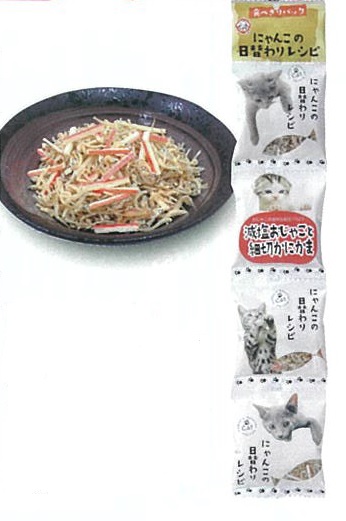 塩分を2分の1以下にカットしたちりめんじゃこに、猫ちゃんのおやつとして大人気のカニカマを混ぜました