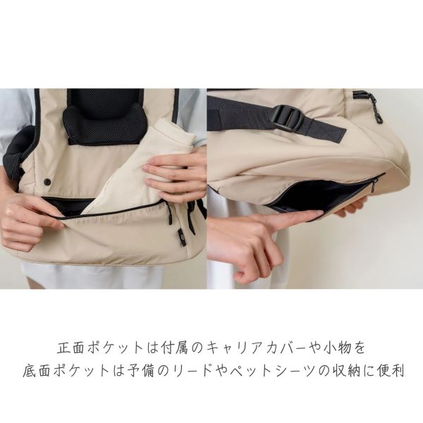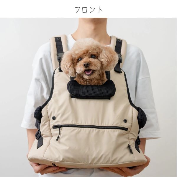 ペットの体重を分散し、肩や腰への負担を軽減する前抱き専用キャリーバッグ。 幅広のショルダーベルトとウエストベルトでしっかりホールド。長時間のお出かけも快適です。付属のキャリーカバーを取り付けることで外界の刺激からペットを守り、中の様子を確認できる前抱きスタイルで安心して移動できます。※ 通気性抜群のメッシュ素材でペットもオーナーも快適。 収納ポケットも充実しているので、おやつやお手入れグッズなど、必要なものをまとめて収納できます。 本体および各種パーツは洗濯ネットに入れて洗濯可能で衛生的。 ※本製品を交通機関で使用する場合、それぞれの交通機関によって「運送約款」が定められておりますので、ご利用になる各交通機関にお問い合わせください。