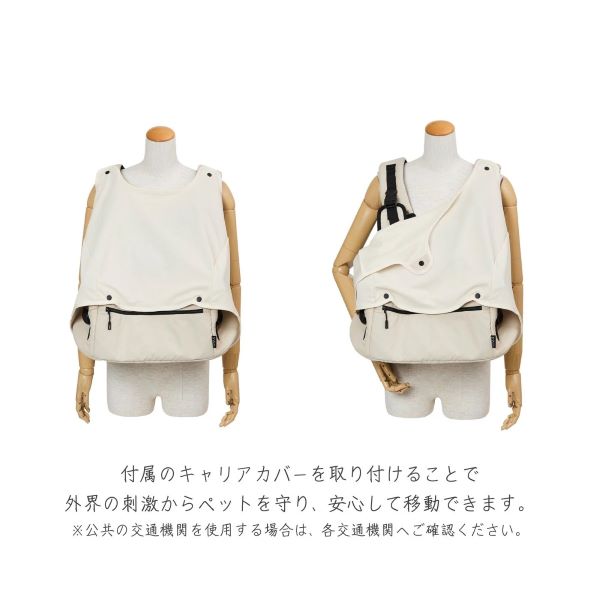 付属のキャリーカバーを取り付けることで外界の刺激からペットを守り、中の様子を確認できる前抱きスタイルで安心して移動できます。※