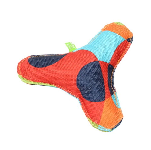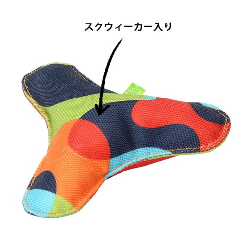 高密度に織られた丈夫なナイロンで作った、ブーメラン型の犬用おもちゃです。プラスチック製よりも口や鼻を傷つけにくく、安全です。中央にスクウィーカーが入っていて、キュッキュッと音も鳴り、ワンちゃんの本能を刺激します。室内・屋外はもちろん、水辺でも毎日楽しく遊ぶことのできるおもちゃです。