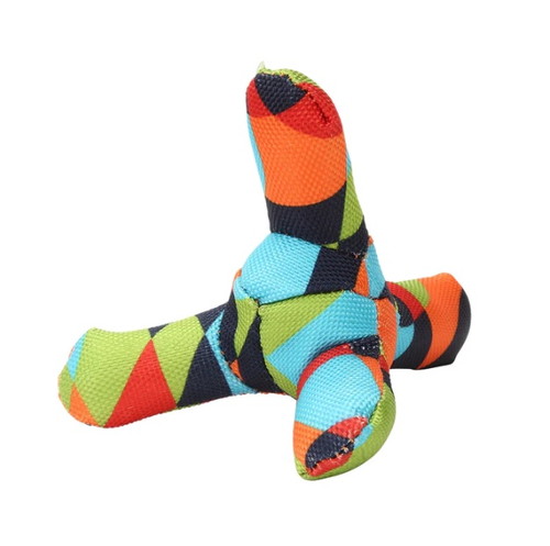 高密度に織られた丈夫なナイロンで作った、手のひらサイズのテトラポット型の犬用おもちゃです。