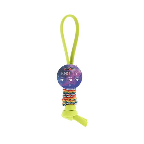 「ノッティー」は、ワンちゃんが大好きなロープおもちゃシリーズです。色鮮やかなビタミンカラーのロープとゴムが、遊ぶ前からワクワク感を盛り上げてくれます。「ノッティー タグ」は、適度な弾力かつ丈夫なTPRゴムの本体に、カラフルなロープをしっかりと巻き付けてあります。丈夫な持ち手が作られているので、愛犬と一緒に楽しめます。噛む・引っ張る・追いかける等、室内外どこでも楽しく遊ぶことができ、ストレス解消やデンタルケアにもおすすめです。