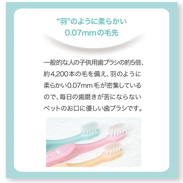 一般的な子供用歯ブラシの5倍以上、約4,200本の毛を備え、“羽”のように柔らかい0.07mm毛が密集しているので、毎日の歯磨きが苦にならないペットのお口に優しい歯ブラシです。
