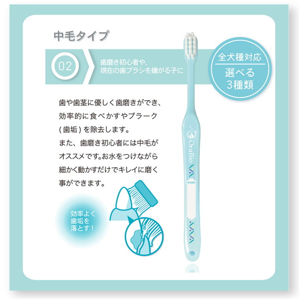 一般的な子供用歯ブラシの5倍以上、約4,200本の毛を備え、“羽”のように柔らかい0.07mm毛が密集しているので、毎日の歯磨きが苦にならないペットのお口に優しい歯ブラシです。中毛タイプ(グリーン):毛の長さ6.5㎜・歯磨き初心者に・現在の歯ブラシは嫌がる子に歯や歯ぐきに優しく歯磨きができ、効率的に食べかすやプラーク(歯垢)を除去します。