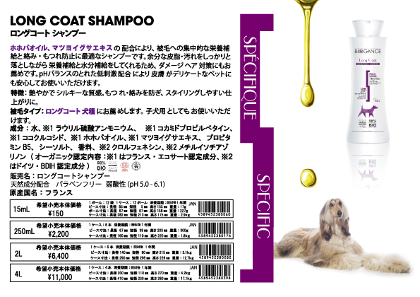 被毛への集中的な栄養と絡み・もつれ防止に最適なシャンプーです。また、静電気防止にも効果があります。時代は流れている・・・自然と科学の融合フランスでナンバーワンのコンプリートケアシリーズバイオガンス