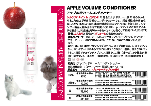 シルクプロテイン&ビタミンE配合のボリューム感が特徴のアップルの香りがするコンディショナーです。パラベンフリー・天然成分配合・合成着色料フリー・フランスNO.1コンプリートケアシリーズ