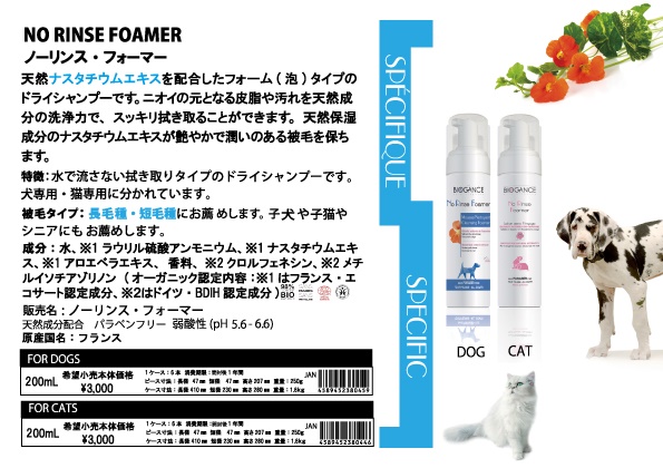 汚れた箇所に揉み込んで、タオルで拭き取るだけ!皮脂や汚れを天然成分の洗浄力で、スッキリ拭き取ることができます。天然の保湿成分のナスタチウムエキスが、艷やかで潤いのある被毛を保ちます。