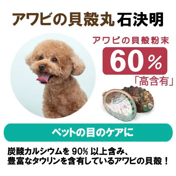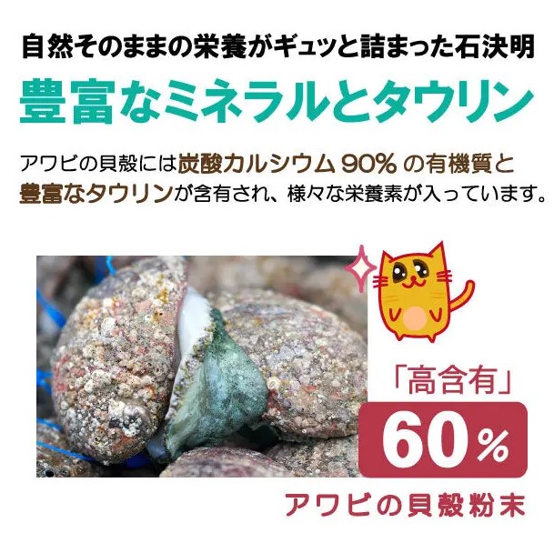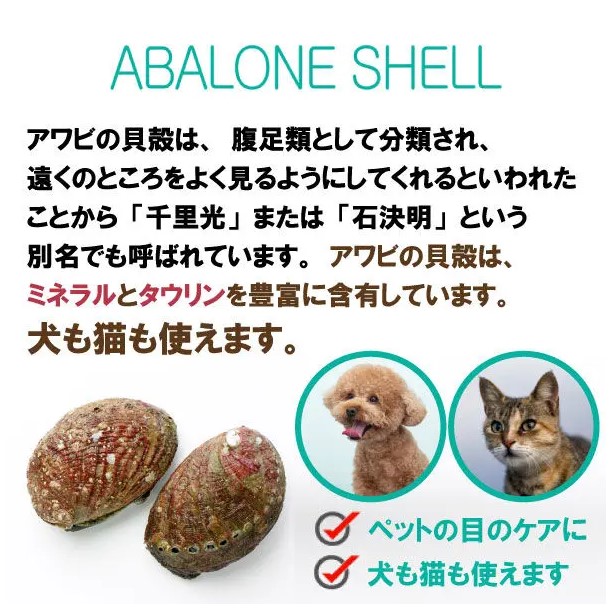 アワビの貝殻丸 石決明「高含有」アワビの貝殻粉末 60%アワビの貝殻は、腹足類として分類され、遠くのところをよく見るようにしてくれるといわれたことから「千里光」または「石決明」という別名でも呼ばれています。アワビの貝殻は、ミネラルとタウリンを豊富に含有しています。自然そのままの栄養がギュッと詰まった石決明アワビの貝殻には炭酸カルシウム90%の有機質と豊富なタウリンが含有され、様々な栄養素が入っています。「高含有」アワビの貝殻粉末 60%犬も猫も使えます。ペット用に使用する場合は、水またはぬるま湯にふやかし与えてあげると良いです。
