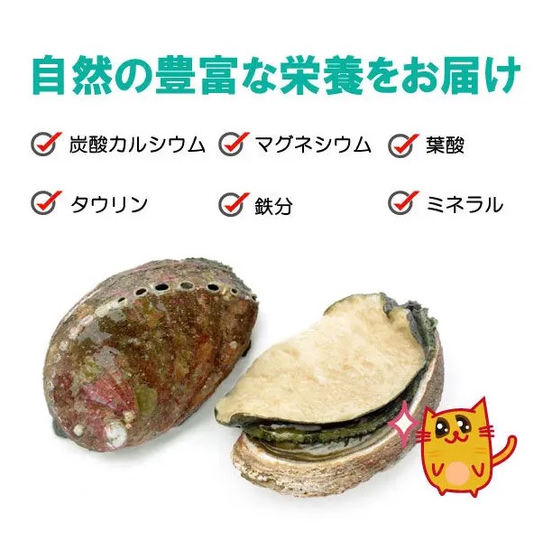 アワビの貝殻には炭酸カルシウム90%の有機質と豊富なタウリンが含有され、様々な栄養素が入っています。
