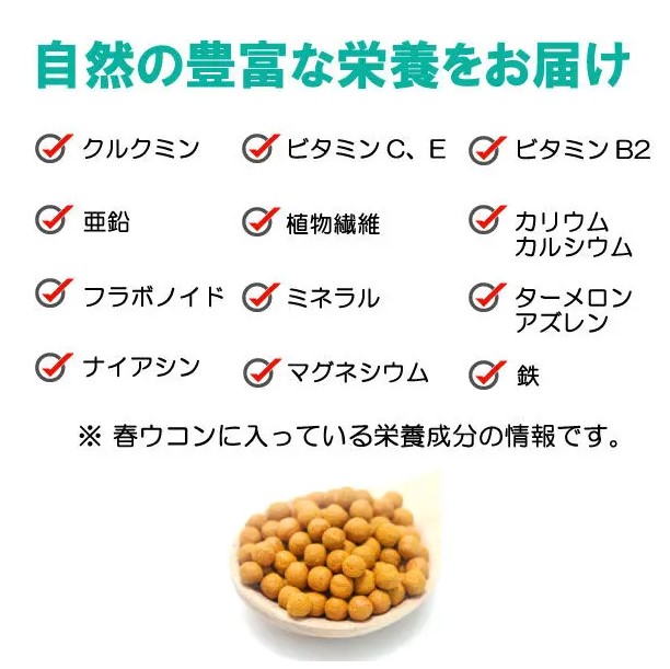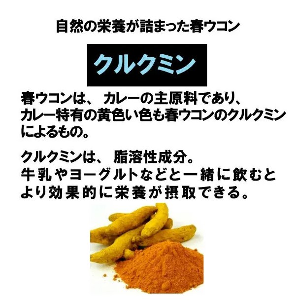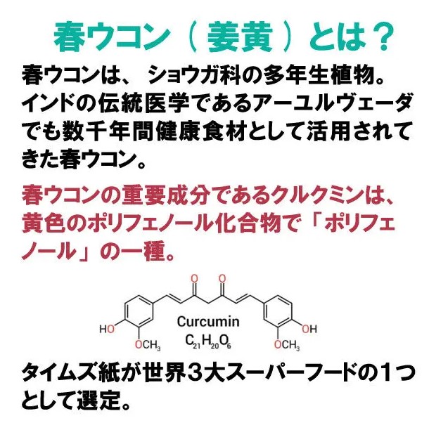 春ウコン(キョウオウ)とは?春ウコンは、ショウガ科の多年生植物、インドの伝統医学であるアーユルヴェーダでも数千年間健康食材として活用されてきた。春ウコンの重要成分であるクルクミンは、黄色のポリフェノール化合物で「ポリフェノール」の一種。タイムズ紙が世界3大スーパーフードの1つとして選定。春ウコンは、カレーの主原料であり、カレー特有の黄色の色も春ウコンのクルクミンによるもの。クルクミンは、脂溶性成分。牛乳やヨーグルトなどと一緒に飲むとより効果的に栄養が摂取できる。