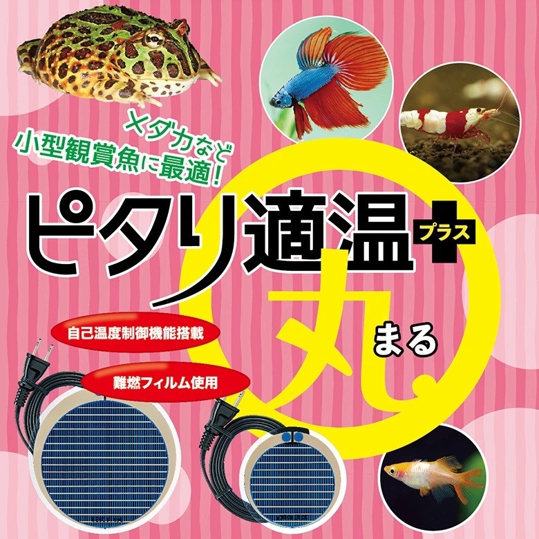 『ピタリ適温プラス丸』は、小型熱帯魚(ベタ、ミドリフグ等)やメダカなどの小型観賞魚を小型水槽で飼育する時に最適なヒーターです。 容器の外(底面等)から暖めるので、水槽内がスッキリします。 サイズは2種類ご用意しました。