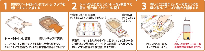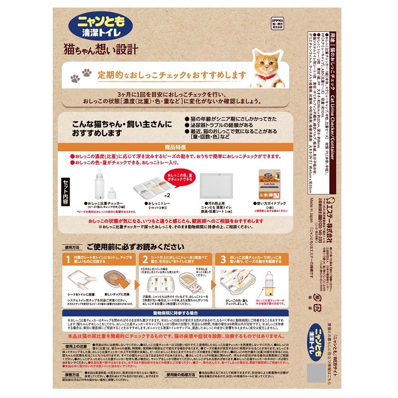 ●おしっこの濃度(比重)に応じて浮き沈みするビーズの動きで、おうちで簡単におしっこチェックができます。 ●おしっこの色・量がチェックできる、おしっこトレー入り。 おしっこの状態が気になる、いつもと違うと感じたら、獣医師へのご相談をおすすめします。 ※おしっこ比重チェッカーで採ったおしっこを、そのまま動物病院に持参の上、ご相談ください。