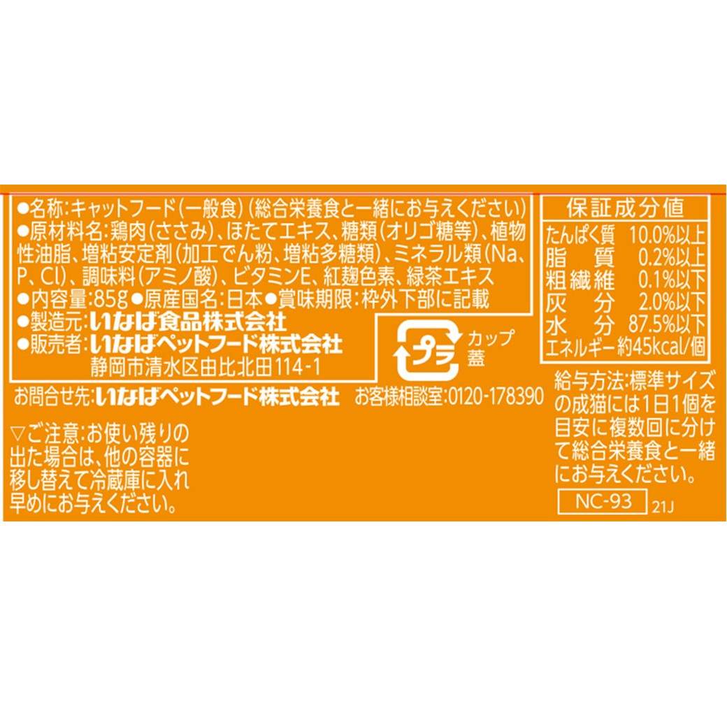 鶏肉(ささみ)、ほたてエキス、糖類(オリゴ糖等)、植物性油脂、増粘安定剤(加工でん粉、増粘多糖類)、ミネラル類(Na、P、Cl)、調味料(アミノ酸)、ビタミンE、紅麹色素、緑茶エキス