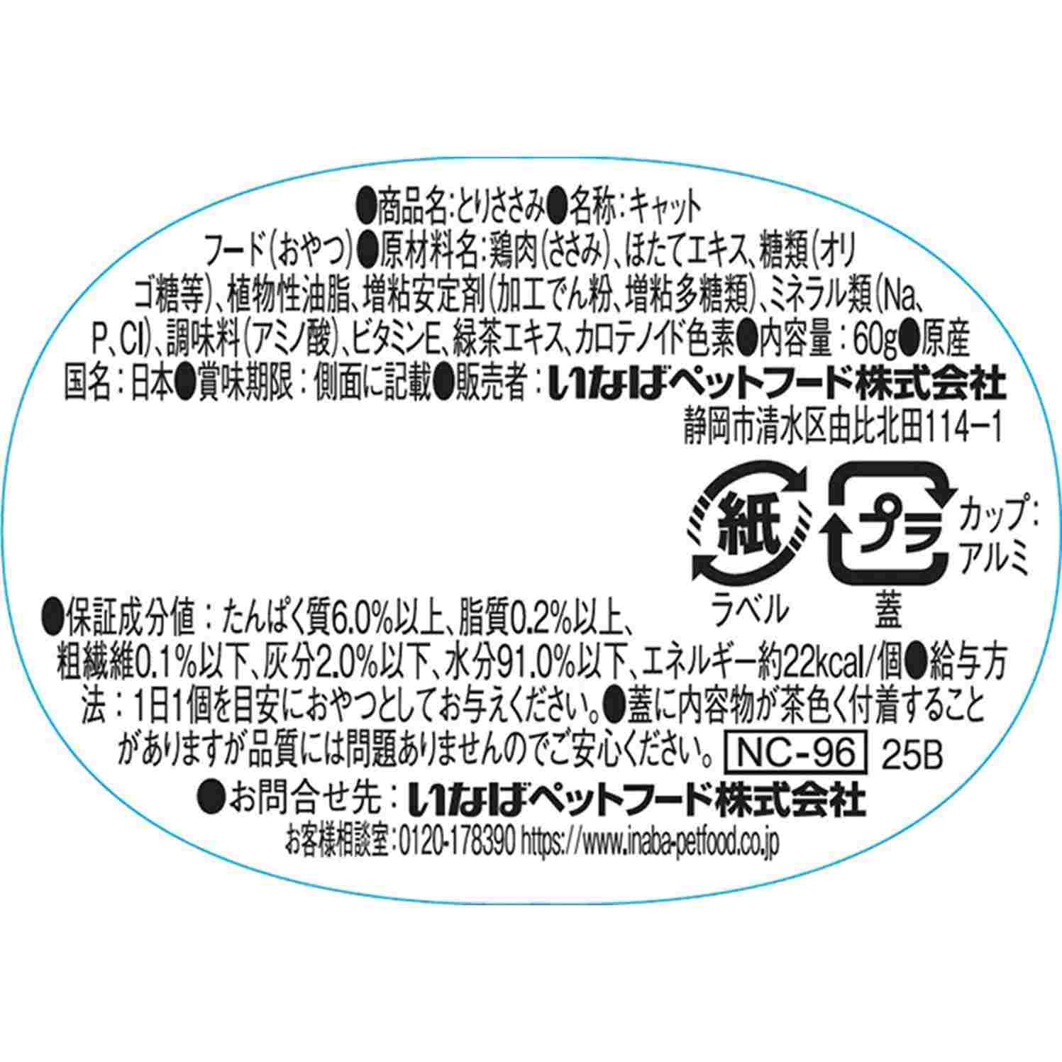 鶏肉(ささみ)、ほたてエキス、糖類(オリゴ糖等)、植物性油脂、増粘安定剤(加工でん粉、増粘多糖類)、ミネラル 類(Na、P、Cl)、調味料(アミノ酸)、ビタミンE、緑茶エキス、カロテノイド色素