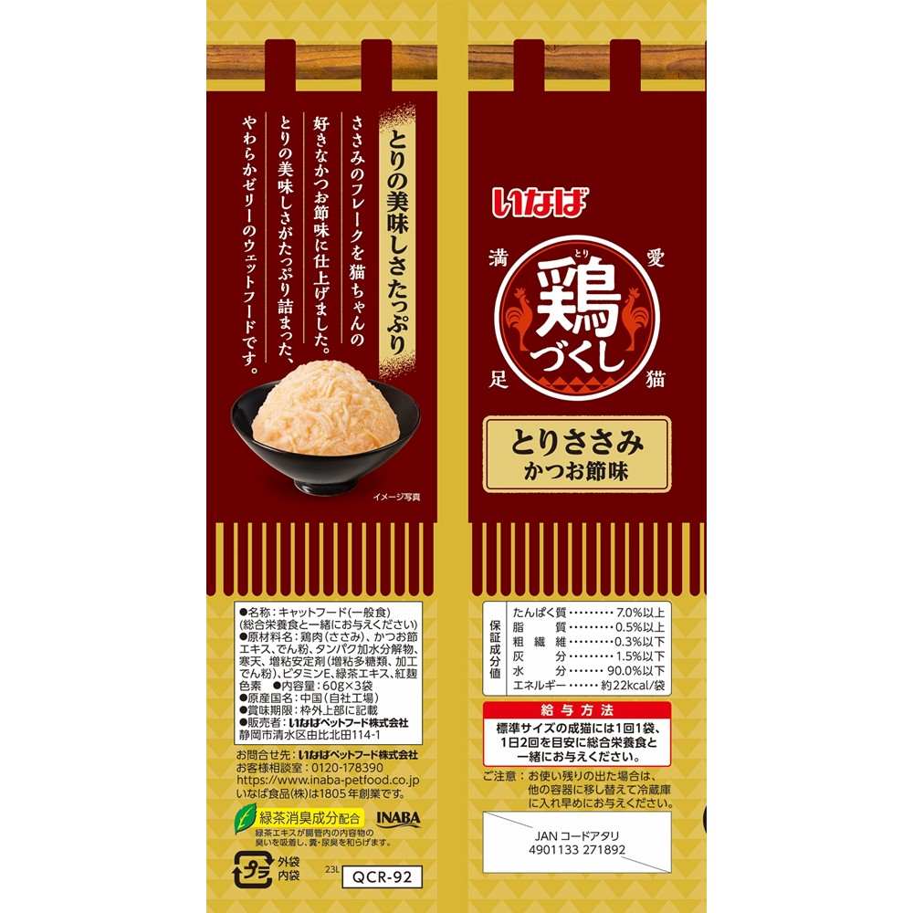 とりささみのペーストに、ねこちゃんの好きなかつお節をトッピング。とりの美味しさがたっぷり詰まった、やわらかゼリータイプのウェットフードです。60g×3袋入りで多頭飼いの家庭でも便利。