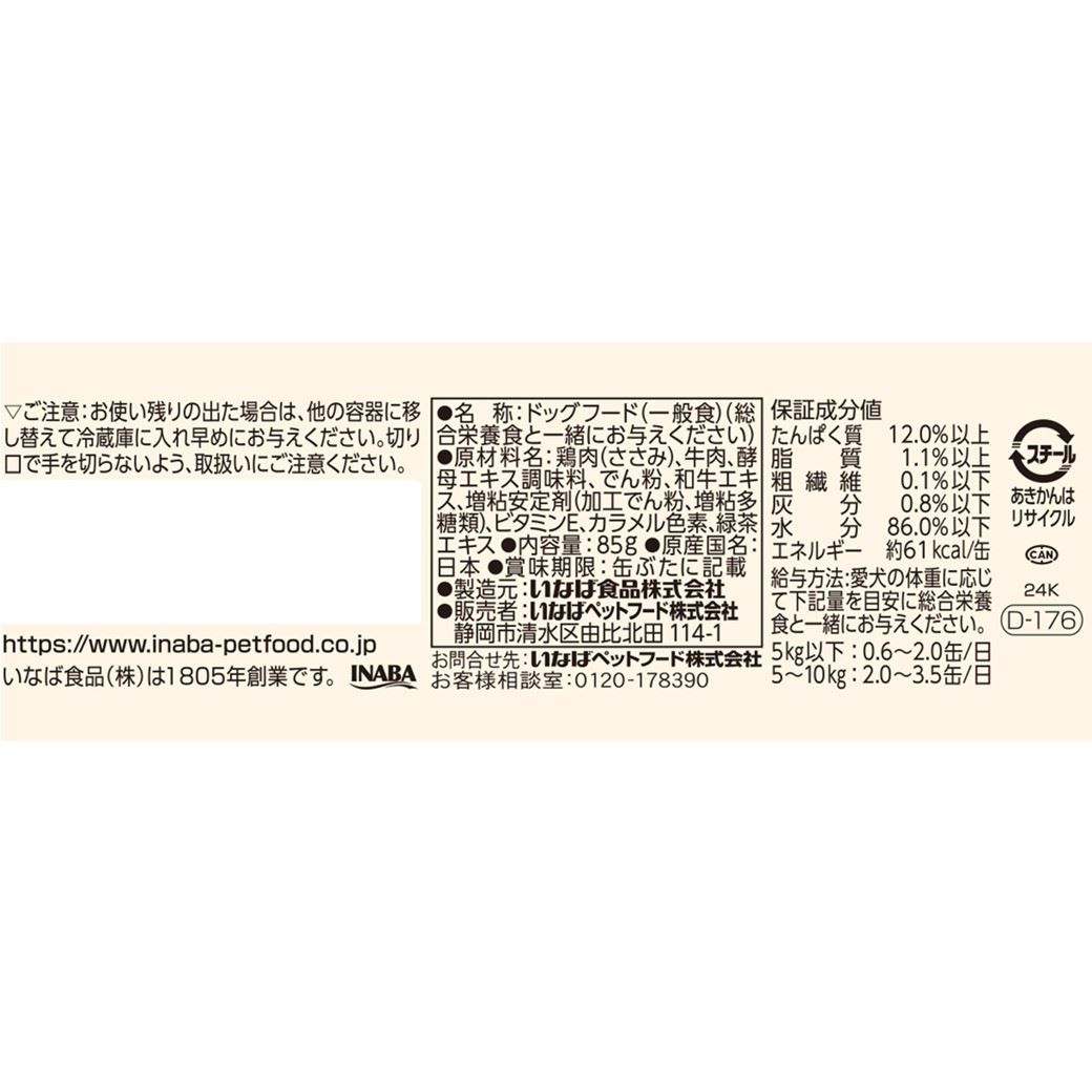 鶏肉(ささみ)、牛肉、酵母エキス調味料、でん粉、和牛エキス、増粘安定剤(加工でん粉、増粘多糖類)、ビタミンE、カラメル色素、緑茶エキスたんぱく質12.0%以上 脂質1.1%以上 粗繊維0.1%以下 灰分0.8%以下 水分86.0%以下
