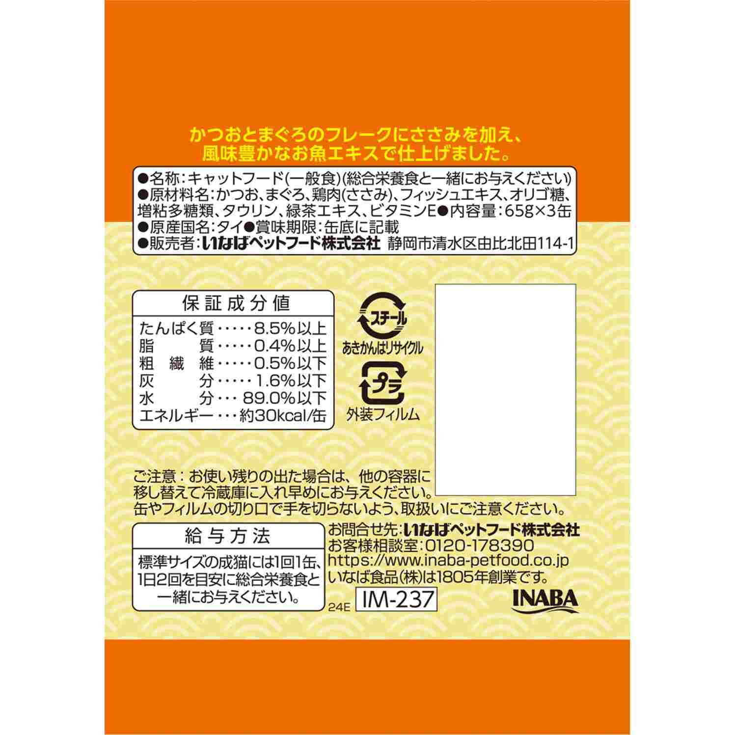 かつお、まぐろ、鶏肉(ささみ)、フィッシュエキス、オリゴ糖、増粘多糖類、タウリン、緑茶エキス、ビタミンEたんぱく質…8.5%以上、脂質…0.4%以上、粗繊維…0.5%以下、灰分…1.6%以下、水分…89.0%以下、エネルギー…約30kcal/缶