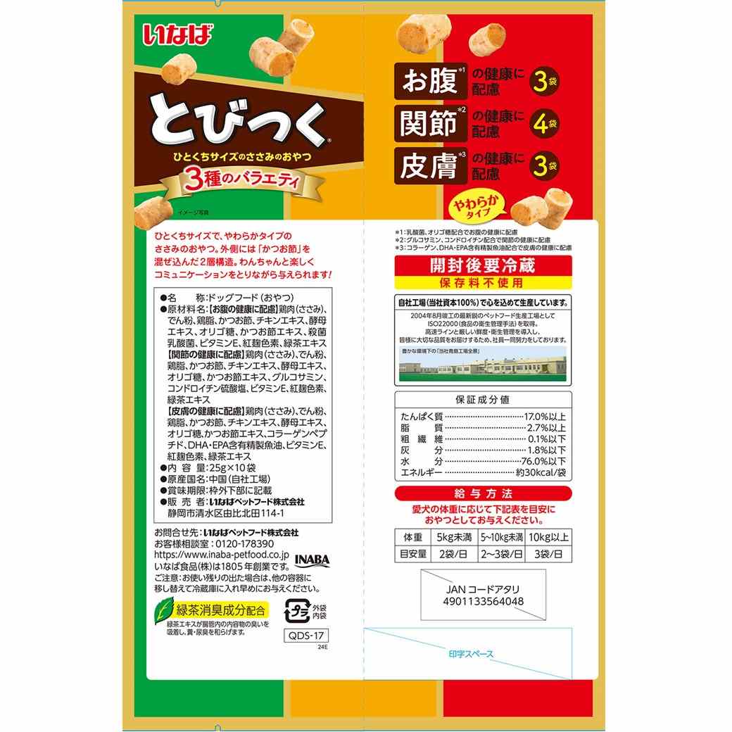 ささみを使用したやわらかおやつ。外にかつお節を練りこんだ2層構造。3種類の味が楽しめるバラエティパック。