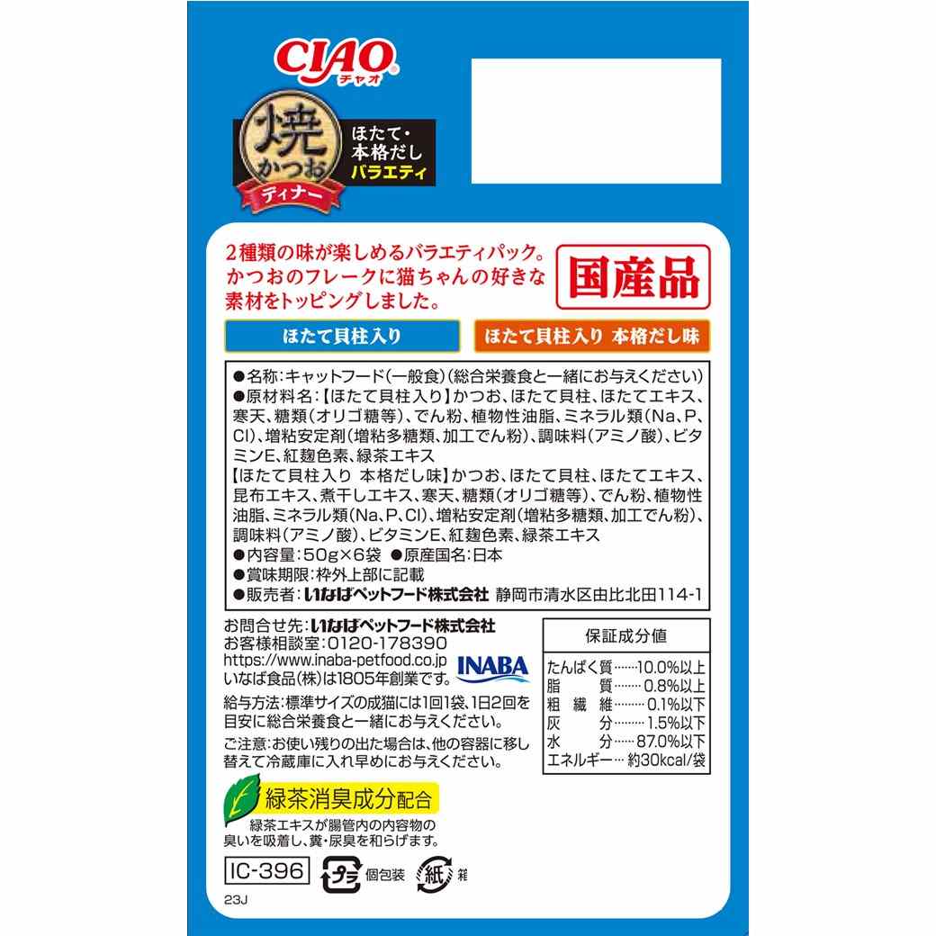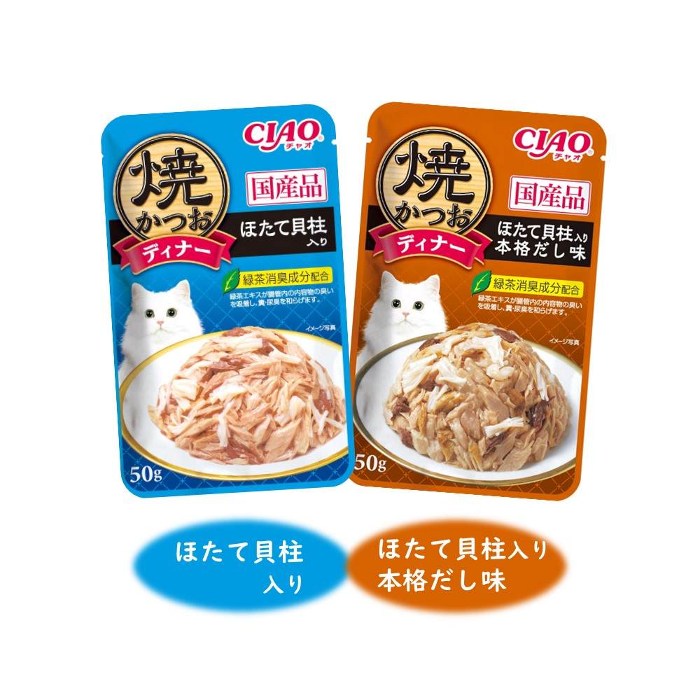 多頭飼いの家庭でも安心のファミリーパック。焼かつおディナーの人気フレーバーを組み合わせたバラエティパック。猫ちゃんの気分に合わせて2種類の味が楽しめます。(子猫用は1種類のみ)国産品。