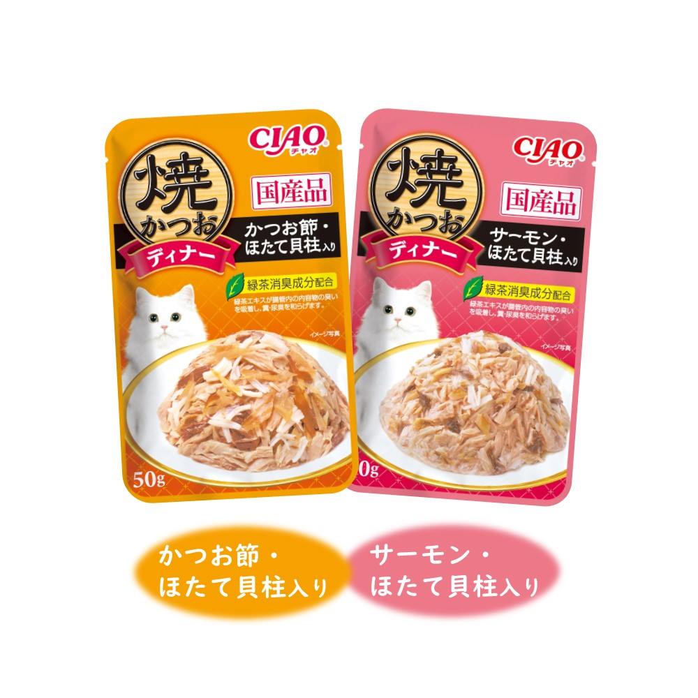 多頭飼いの家庭でも安心のファミリーパック。焼かつおディナーの人気フレーバーを組み合わせたバラエティパック。猫ちゃんの気分に合わせて2種類の味が楽しめます。(子猫用は1種類のみ)国産品。