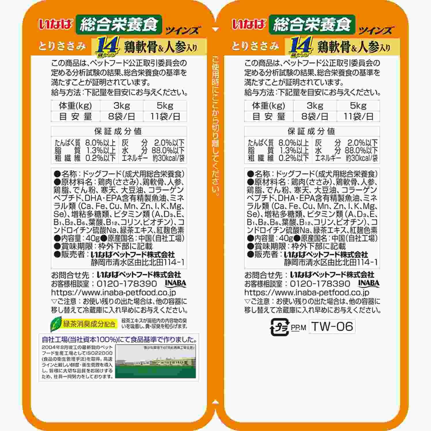 鶏肉(ささみ、軟骨)、人参、大豆油、でん粉、寒天、コラーゲンペプチド、DHA・EPA含有精製魚油、ミネラル類(Ca、Zn、Cu、Mn、Fe)、増粘多糖類、ビタミン類(E、A、ビオチン、D3、葉酸、B6)、コンドロイチン硫酸Na、緑茶エキス、紅麹色素たんぱく質8.0%以上、脂質1.3%以上、粗繊維0.2%以下、灰分2.0%以下、水分88.0%以下