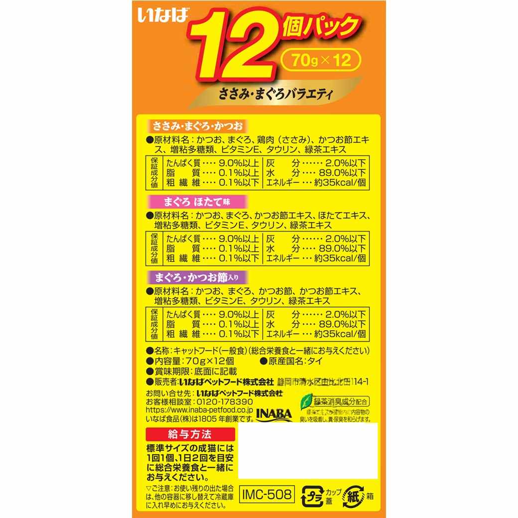 本格かつおだしを加えた、風味豊かなとろみタイプ。かつおやまぐろの丸ごとフレークをベースに愛猫の喜ぶ素材をトッピング。ささみバラエティは高たんぱく質、低脂肪のとりささみをベースに愛猫の喜ぶ素材をトッピング。3種類の味が入った便利な12個パックです。タウリン、ビタミンE配合。着色料不使用。タイ産。