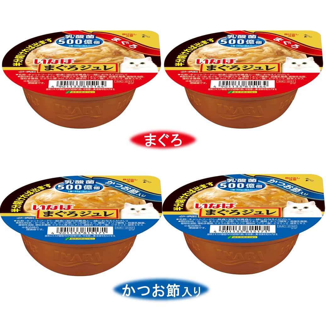 つるんと出しやすいジュレでまぐろと素材を包みました。1個あたり乳酸菌500億個配合で、猫ちゃんの健康を維持し、お腹の調子を保ちます。風味豊かなかつおだしを使用。開けやすく、出しやすいカップ容器を使用。2種類味が楽しめるバラエティパック。タイ産。