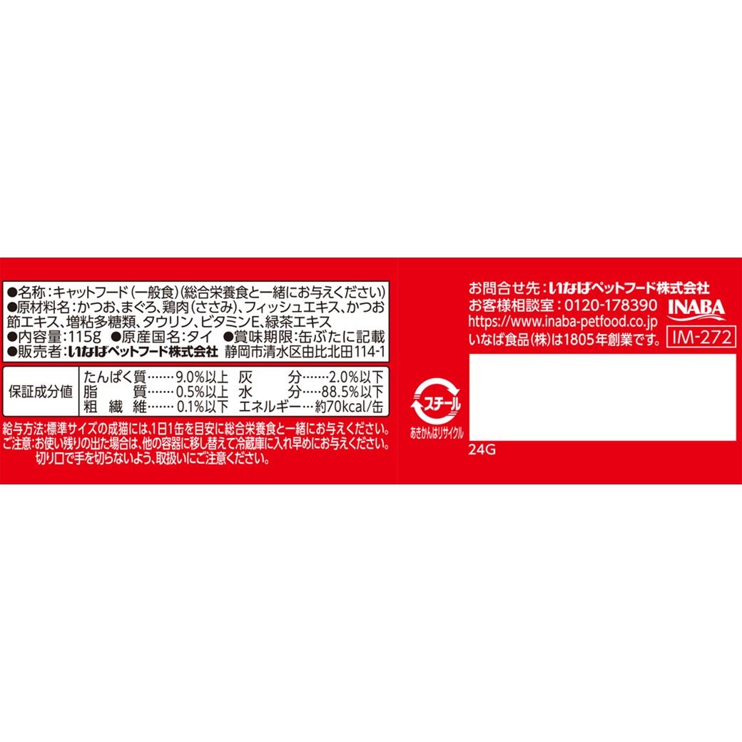 かつお、まぐろ、鶏肉(ささみ)、フィッシュエキス、かつお節エキス、増粘多糖類、タウリン、ビタミンE、緑茶エキスたんぱく質9.0%以上、脂質0.5%以上、粗繊維0.1%以下、灰分2.0%以下、水分88.5%以下