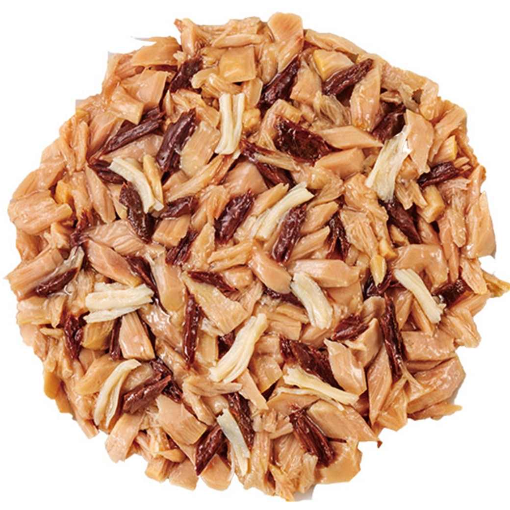 血合肉付きの白身をフレークにしささみをトッピング、ゼリーでコーティングしました。タウリン、ビタミンE配合。着色料不使用。国産品。