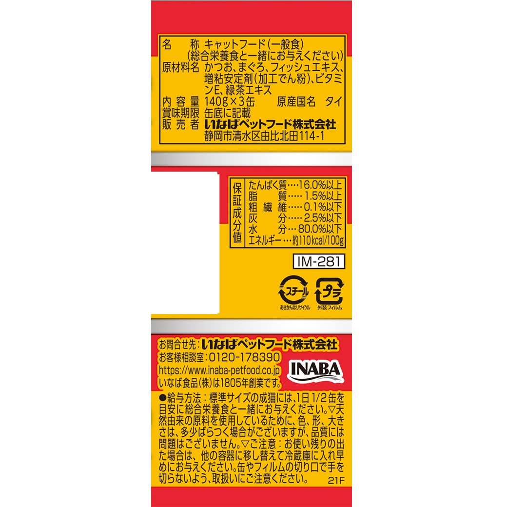 かつお、まぐろ、フィッュエキス、増粘剤(加工でん粉)、ビタミンE、緑茶エキスたんぱく質16.0%以上、脂質1.5%以上、粗繊維0.1%以下、灰分2.5%以下、水分80.0%以下