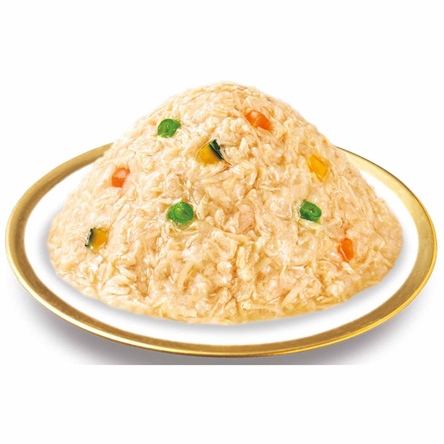 鶏肉(ささみ)、野菜類(人参、かぼちゃ、いんげん)、鶏脂、チキンエキス、チキンエキスパウダー(イミダゾールジペプチド含有)、酵母エキス、N-アセチルグルコサミン、増粘安定剤(増粘多糖類、加工でん粉)、ビタミンE、緑茶エキスたんぱく質8.0%以上 脂質1.2%以上 粗繊維0.3%以下 灰分1.2%以下 水分89.3%以下