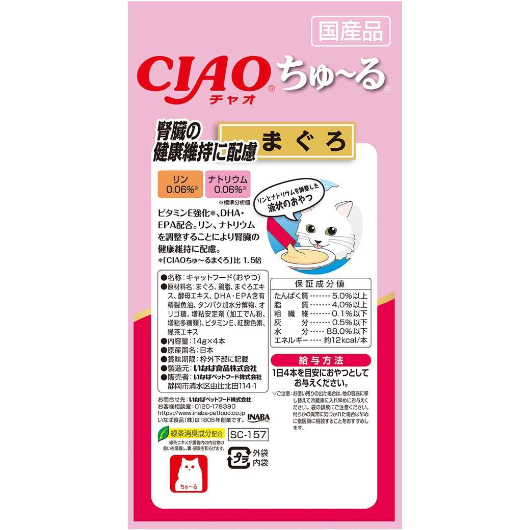 ビタミンE強化(「CIAOちゅ~る まぐろ」比1.5倍)、DHA・EPA配合。リン、ナトリウムを調整することにより腎臓の健康維持に配慮しました。ちゅ~っと出して、なめるだけで簡単に栄養補給。