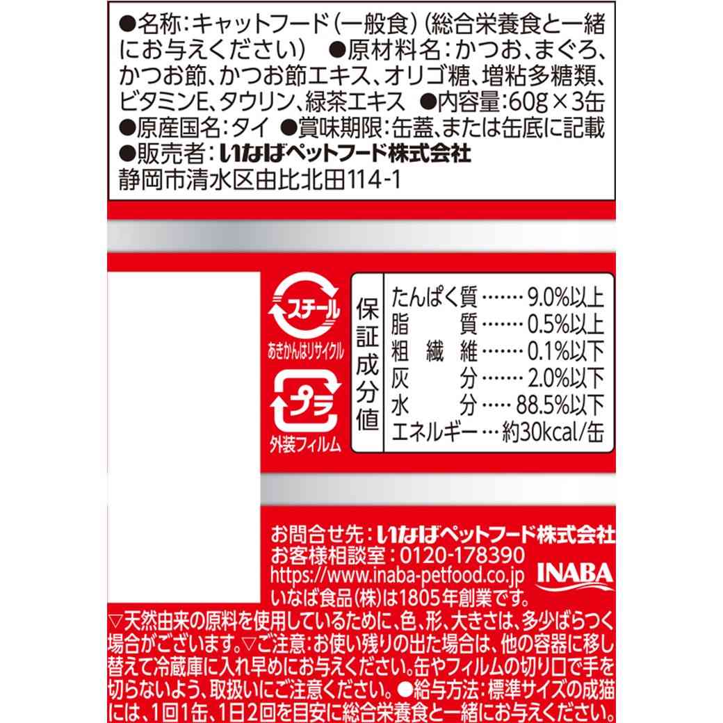 かつお、まぐろ、かつお節、かつお節エキス、オリゴ糖、増粘多糖類、ビタミンE、タウリン、緑茶エキスたんぱく質9.0%以上、脂質0.5%以上、粗繊維0.1%以下、灰分2.0%以下、水分88.5%以下