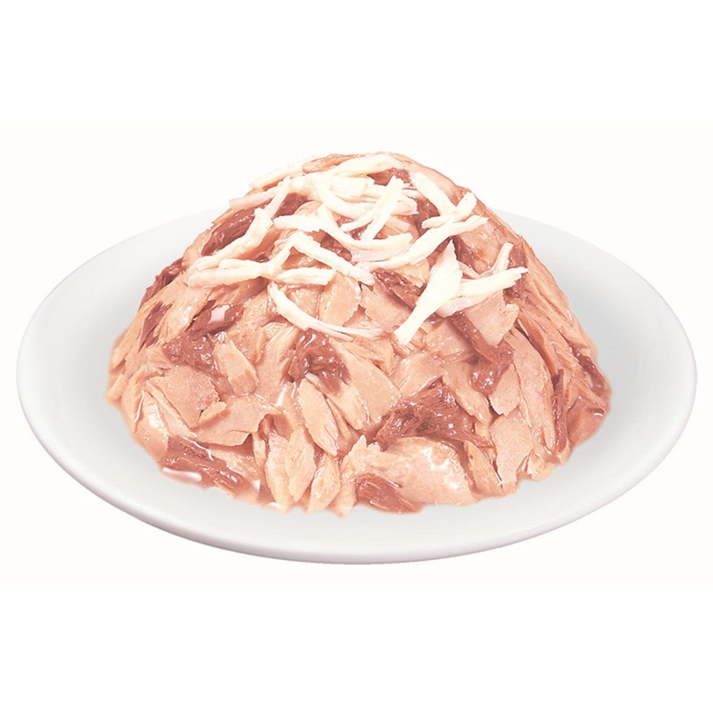 おいしいだしは美しい「金色」の輝き。そんなおいしさを伝える「金のだし」。まぐろとかつおのフレークにささみを加え、おいしいかつおだしと昆布だしのゼリーで包みました。
