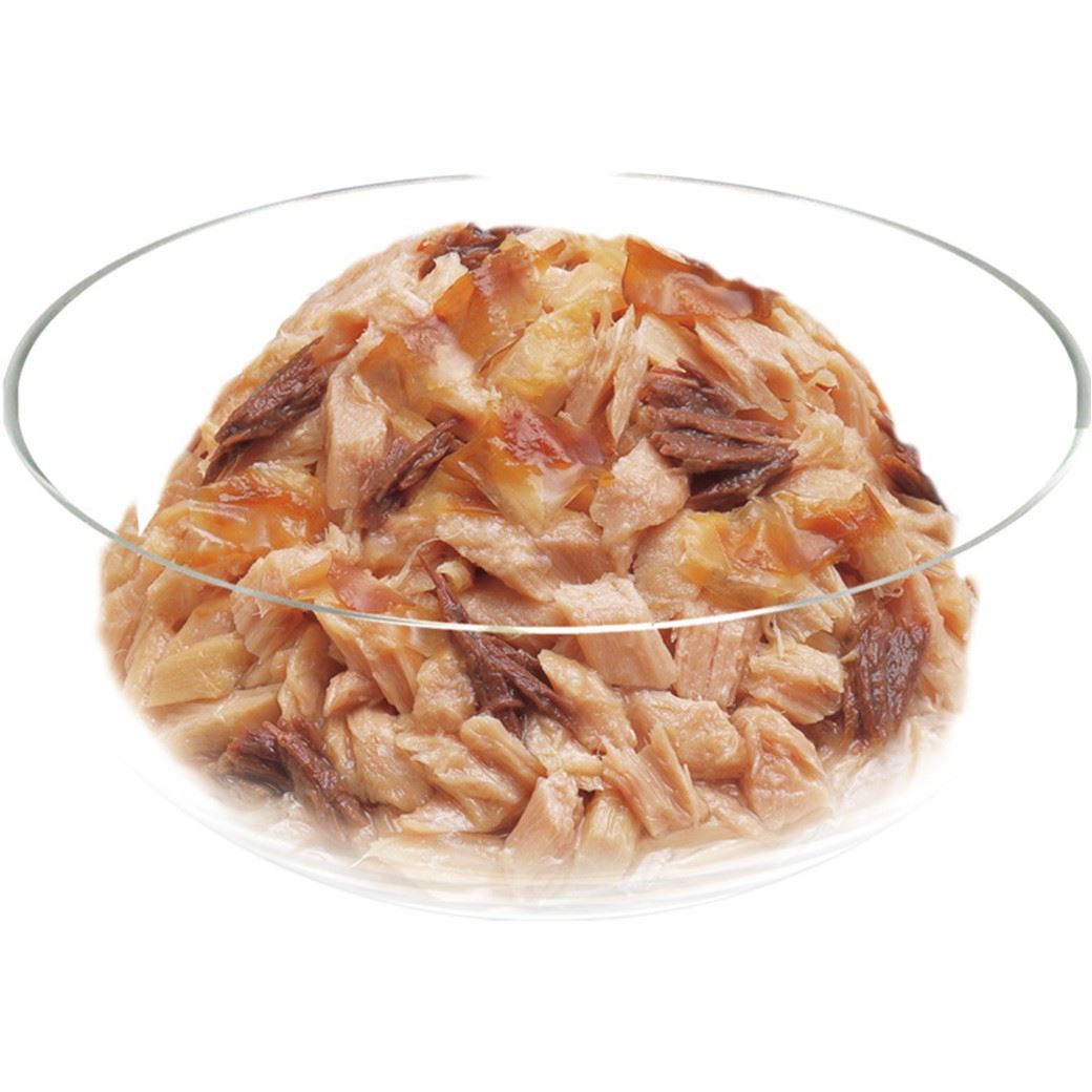 おいしいだしは美しい「金色」の輝き。そんなおいしさを伝える「金のだし」。まぐろとかつおのフレークにまぐろ節を加え、おいしいかつおだしと昆布だしのゼリーで包みました。