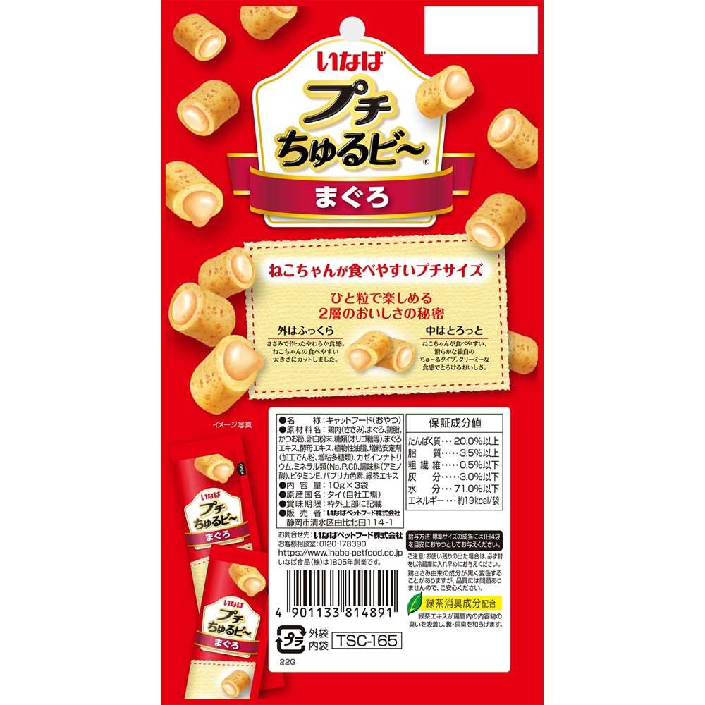 鶏肉(ささみ)、まぐろ、鶏脂、かつお節、卵白粉末、糖類(オリゴ糖等)、まぐろエキス、酵母エキス、植物性油脂、増粘安定剤(加工でん粉、増粘多糖類)、カゼインナトリウム、ミネラル類、調味料(アミノ酸)、ビタミンE、パプリカ色素、緑茶エキスたんぱく質20.0%以上、脂質3.5%以上、粗繊維0.5%以下、灰分3.0%以下、水分71.0%以下