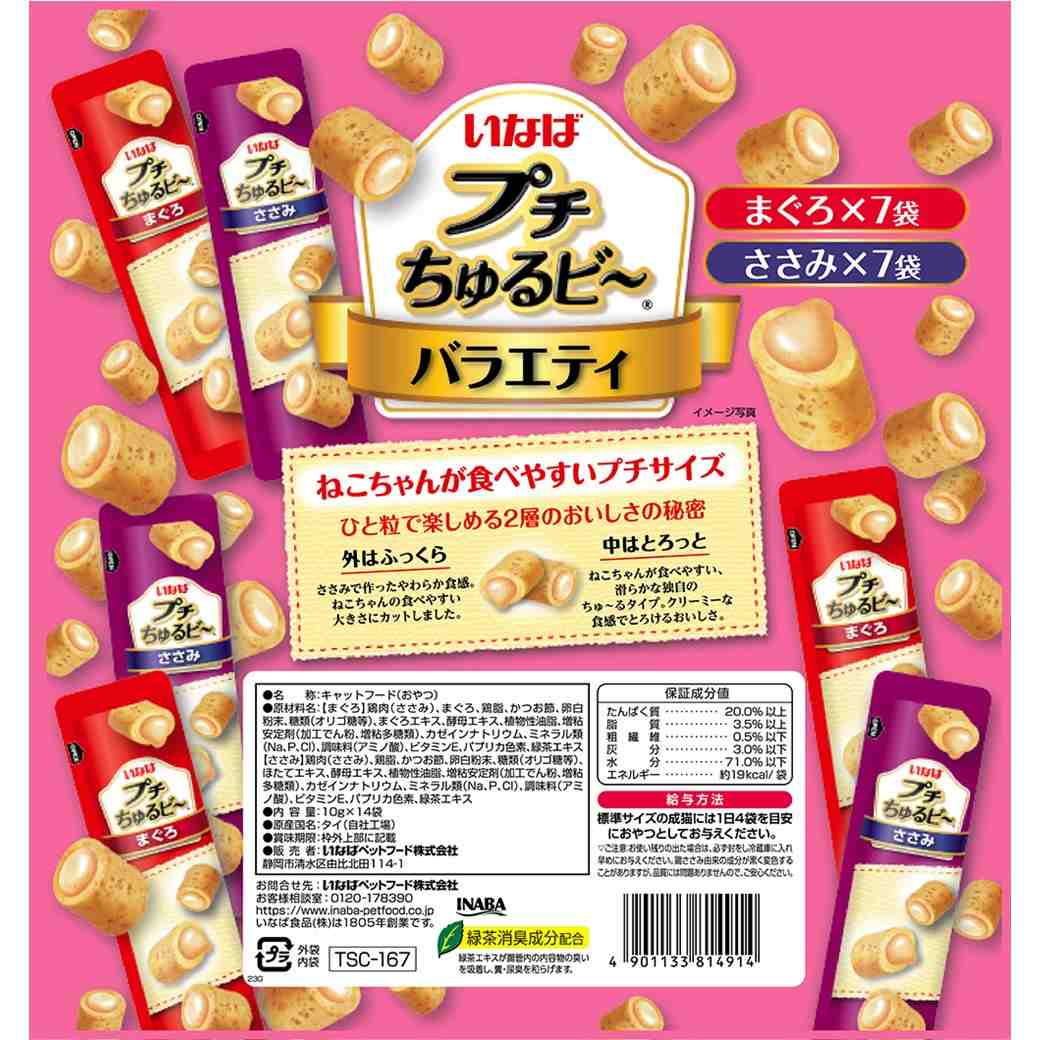猫ちゃんが食べやすい小粒タイプ。外はふっくら、中はトロッと2つの食感が楽しめます。2種類の味が楽しめるバラエティパック。