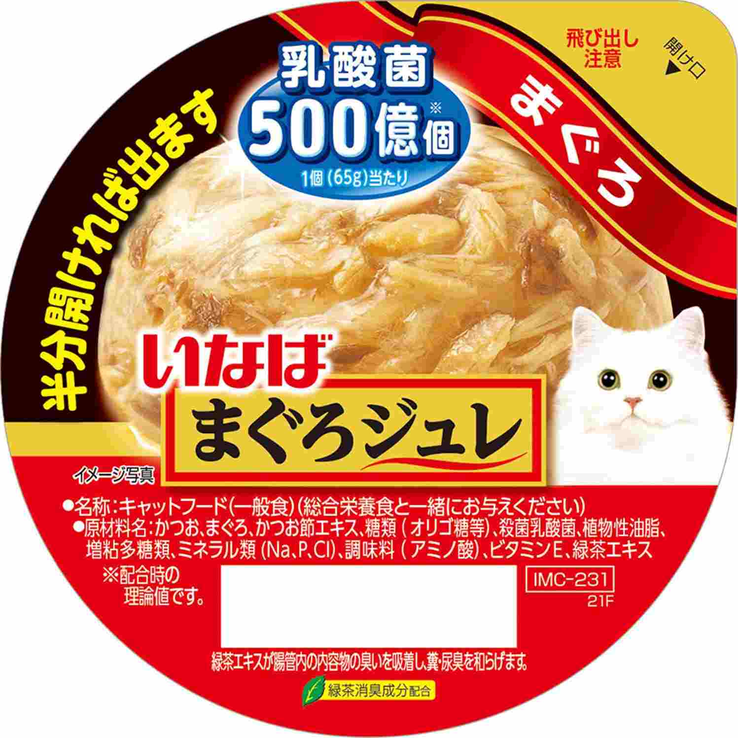 つるんと出しやすいジュレでまぐろを包みました。乳酸菌500億個配合で、猫ちゃんの健康を維持し、お腹の調子を保ちます。風味豊かなかつおだしを使用。開けやすく、出しやすいカップ容器を使用。タイ産。