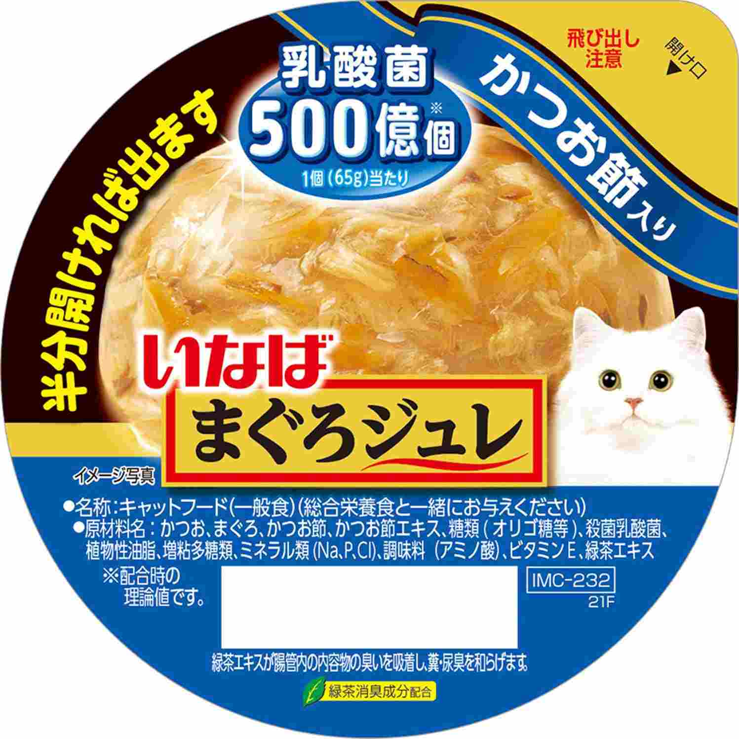 つるんと出しやすいジュレでまぐろとかつお節を包みました。乳酸菌500億個配合で、猫ちゃんの健康を維持し、お腹の調子を保ちます。風味豊かなかつおだしを使用。開けやすく、出しやすいカップ容器を使用。タイ産。