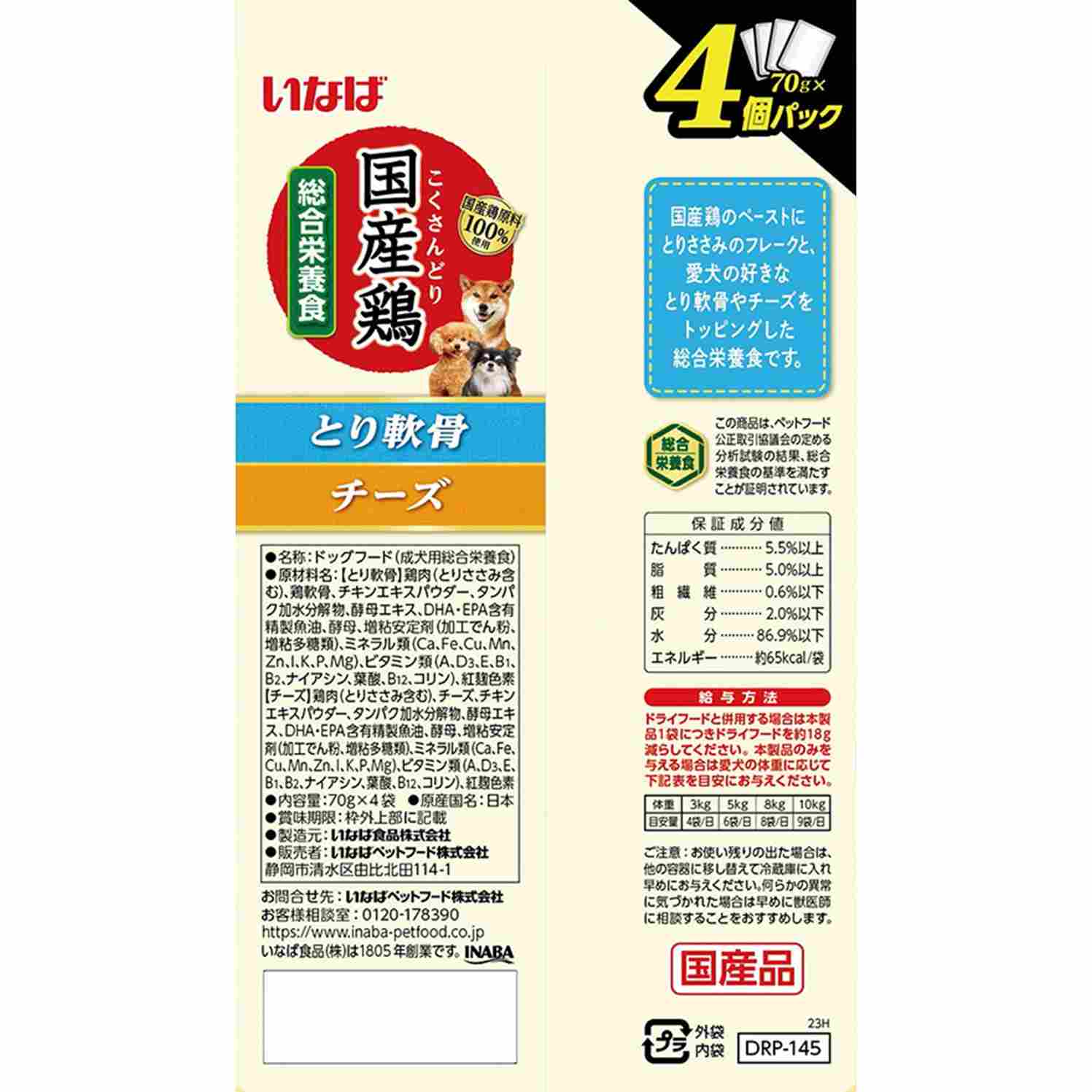 国産鶏のペーストにとりささみのフレークと、とり軟骨やチーズをトッピング。わんちゃんに必要な栄養素をバランスよく配合した総合栄養食。4個パックで多頭飼いの家庭でも便利です。